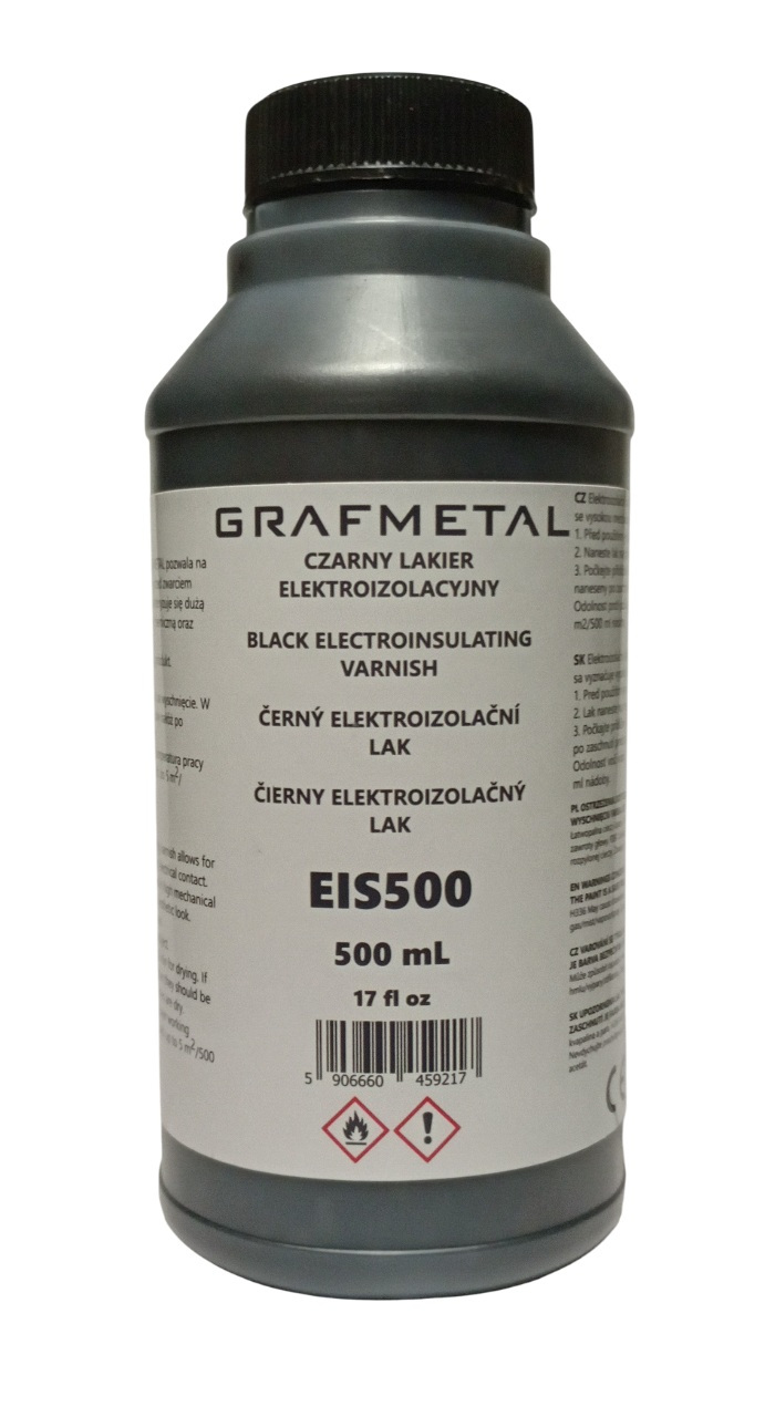 GRAFMETAL BLACK electroinsulating varnish allows for protecting elements against electrical contact. The product is characterised in high mechanical and chemical strength and aesthetic look. This offer applies to 500 ml container of the product.