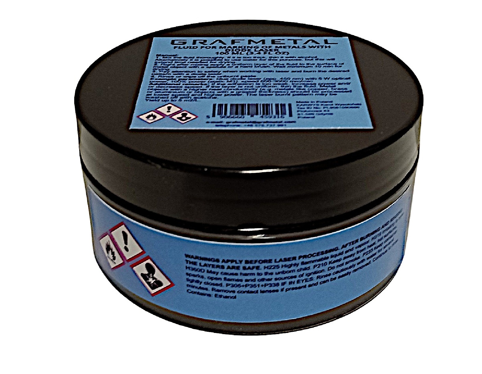 GRAFMETAL fluid for marking of metals with diode laser is intended to be used for marking of metals with devices utilizing blue laser for engraving. Fluid works with devices with at least 1 W of optical power, for faster work minimum 5 W is recommended. Fluid is not intended to be used with CO2 lasers. Layers after being cured with a laser from engraving machine are durable and water resistant, but they can be washed off with a solvent if needed.