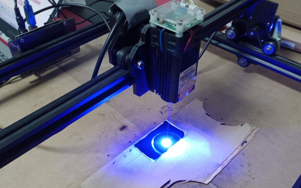 Example parameters: blue diode laser (approximately 450 nm) with 5 W of optical power, 100% of power (static M3), 600 mm/min speed.