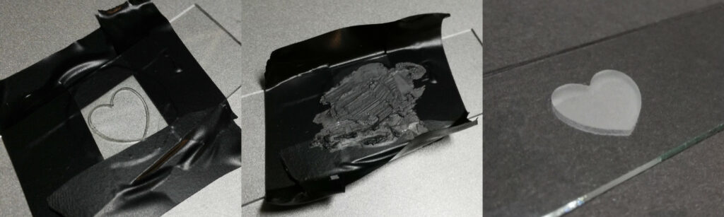 Preparing the surface is easy and it is based on cutting the pattern in a mask e.g. by a plotter or by applying an appropriate adhesive tape and then engraving it with a laser like in the pictures shown below.